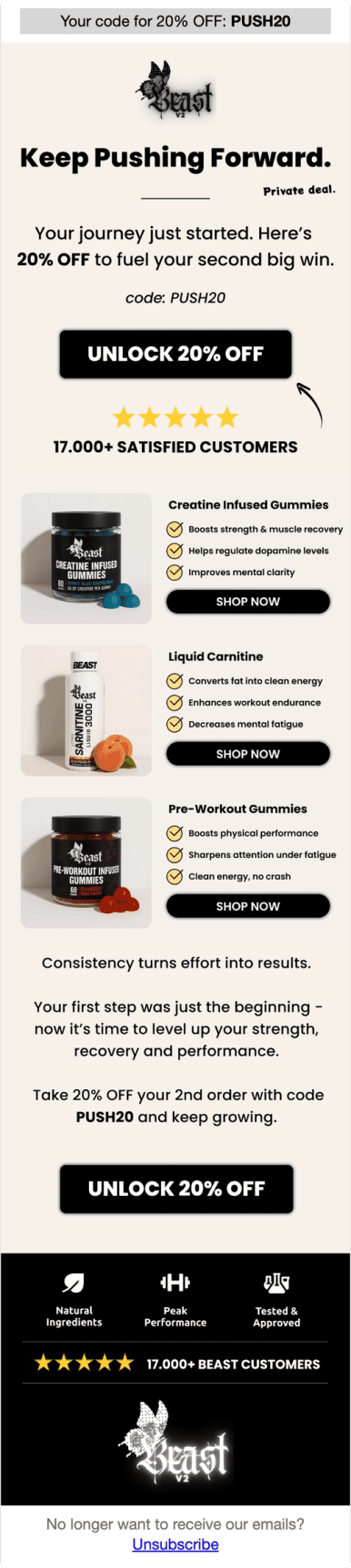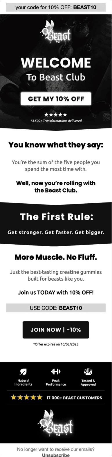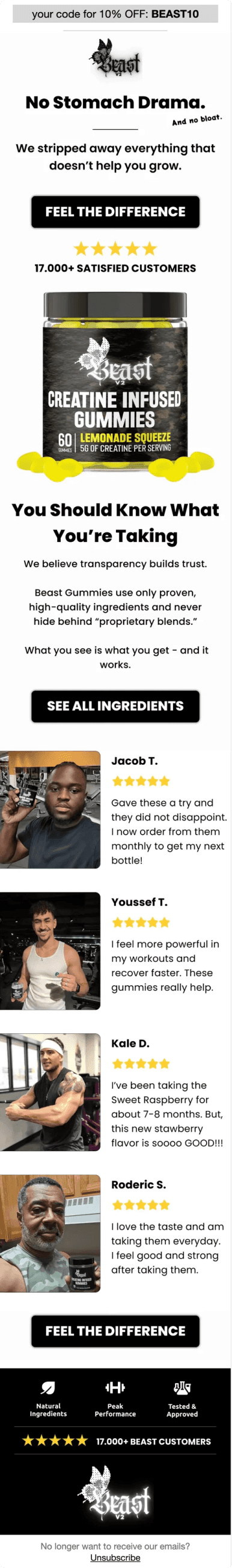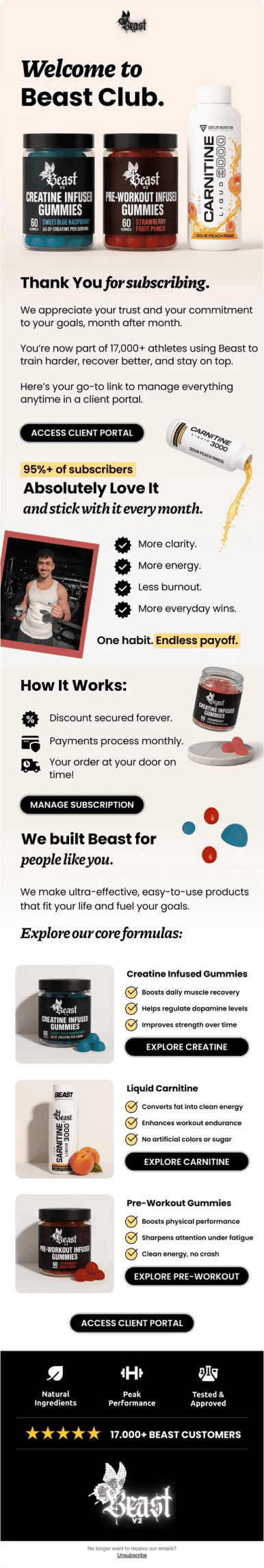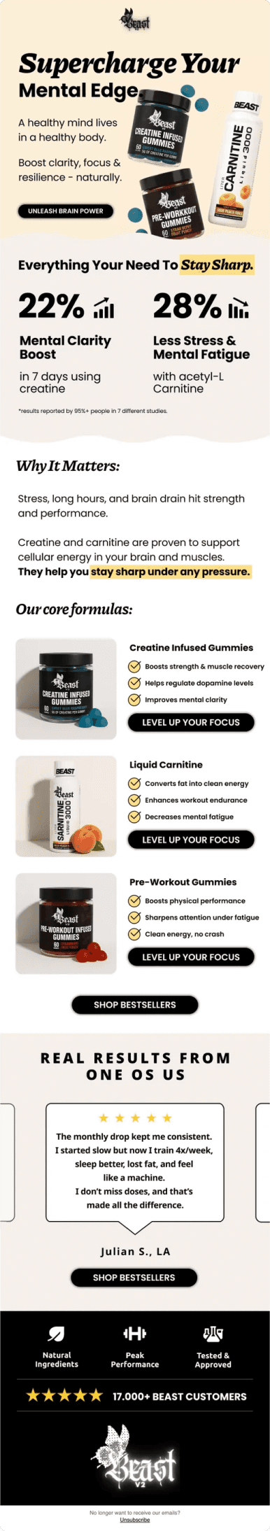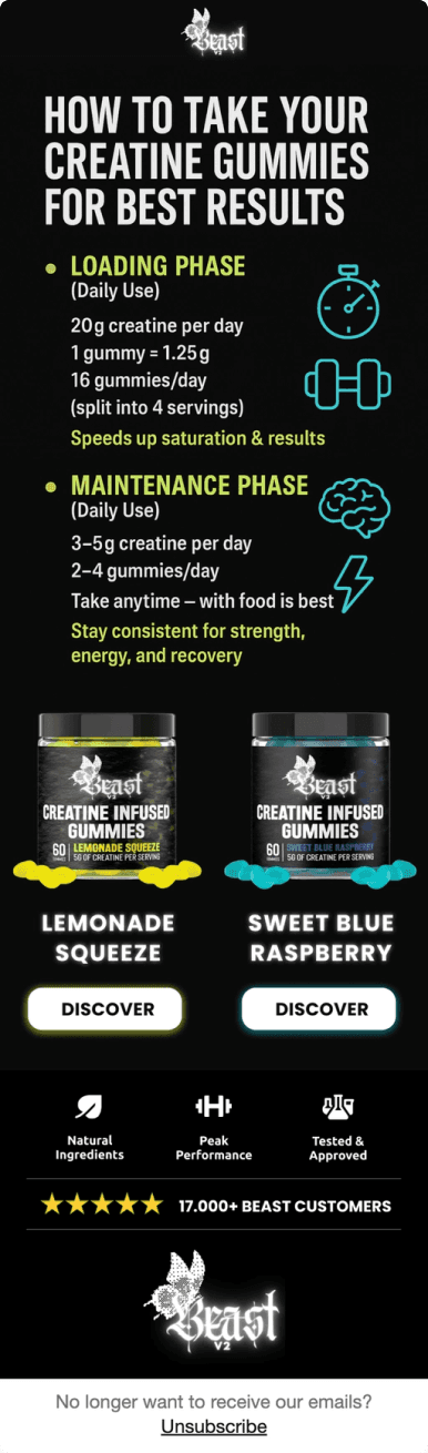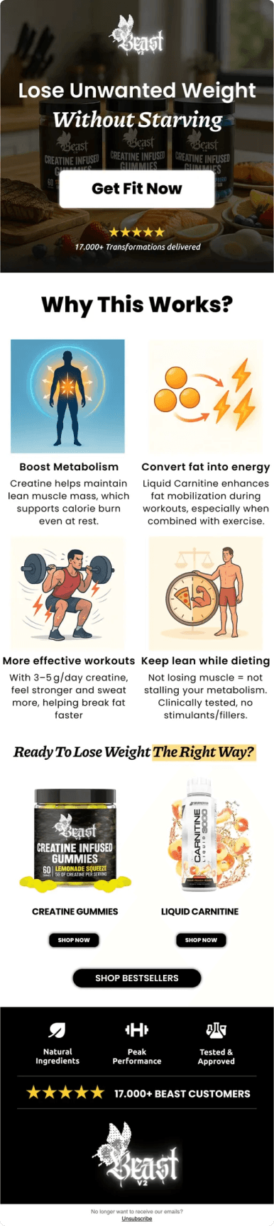 Beast propose des compléments alimentaires premium sous forme de gummies innovantes : créatine, pré-workout caféiné et carnitine liquide. Des suppléments haute qualité pour optimiser les performances sportives au quotidien.