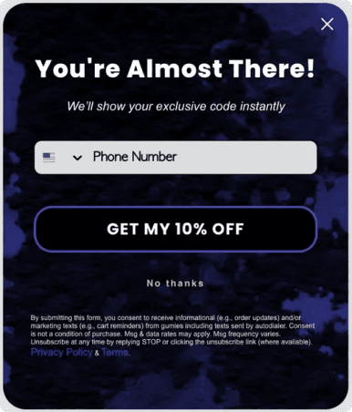 J'ai décidé de partir sur une Pop-up en 2 étapes au départ, et grâce à de nombreux A/B tests, j'ai réussi à intégrer la collecte du numéro de téléphone tout en maintenant un taux d'opt-in à 12 %+